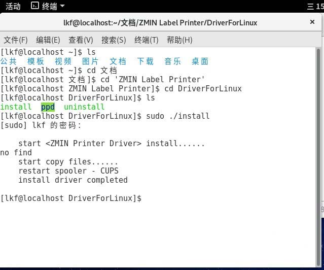 1、启动Fedora 24到桌面,下载并解压缩得到条码打印机驱动安装程序,命令行安装打印机驱动