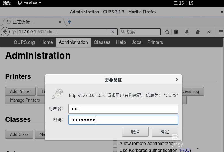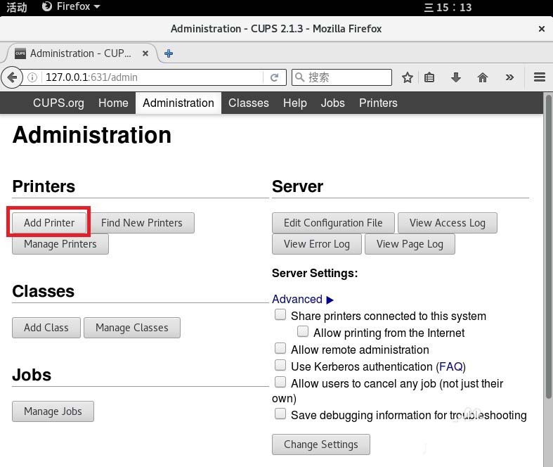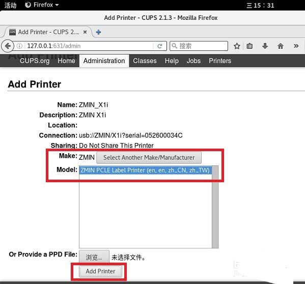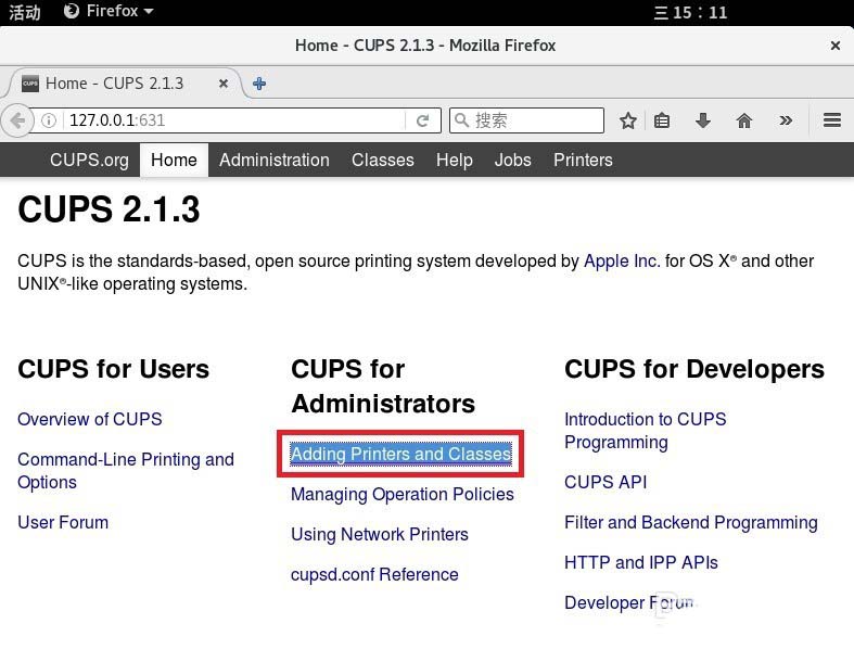 2、连接好条码打印机的USB线缆,打开打印机电源。在浏览器输入http://127.0.0.1:631,从本地631端口进入打印机配置系统,点击 "Adding Printers and Classes"