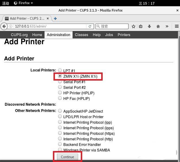 5、选择打印机:"ZMIN X1i(ZMIN X1i)",点击 "Continue" 按钮