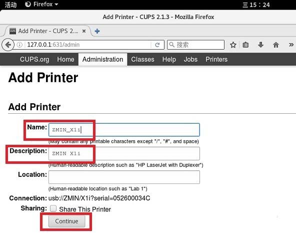 6、输入打印机名称和描述等信息,点击 "Continue" 按钮