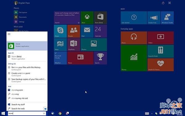 还可以看到明显的变化在于,开始菜单底部集成了一个新的搜索框,按照微软的意思其支持全局搜索,允许用户搜索本地和在线的内容,毋庸置疑其背后的技术支持就是Bing和Cortana语音助手。