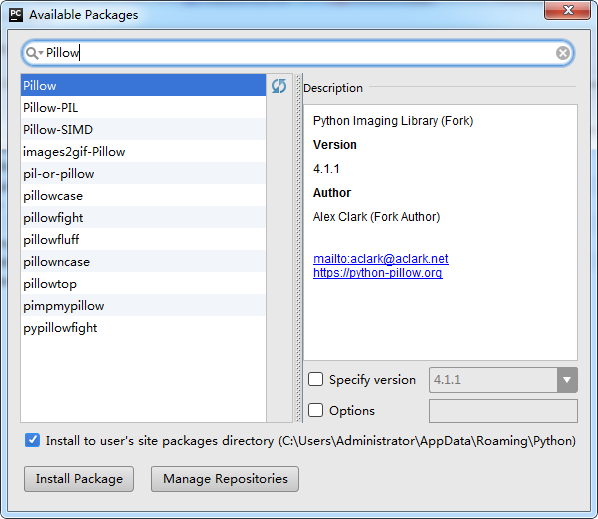 ↑ 搜索 Pillow 包,选中 Pillow,点击 Install Package 安装