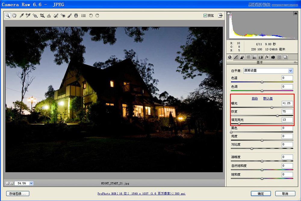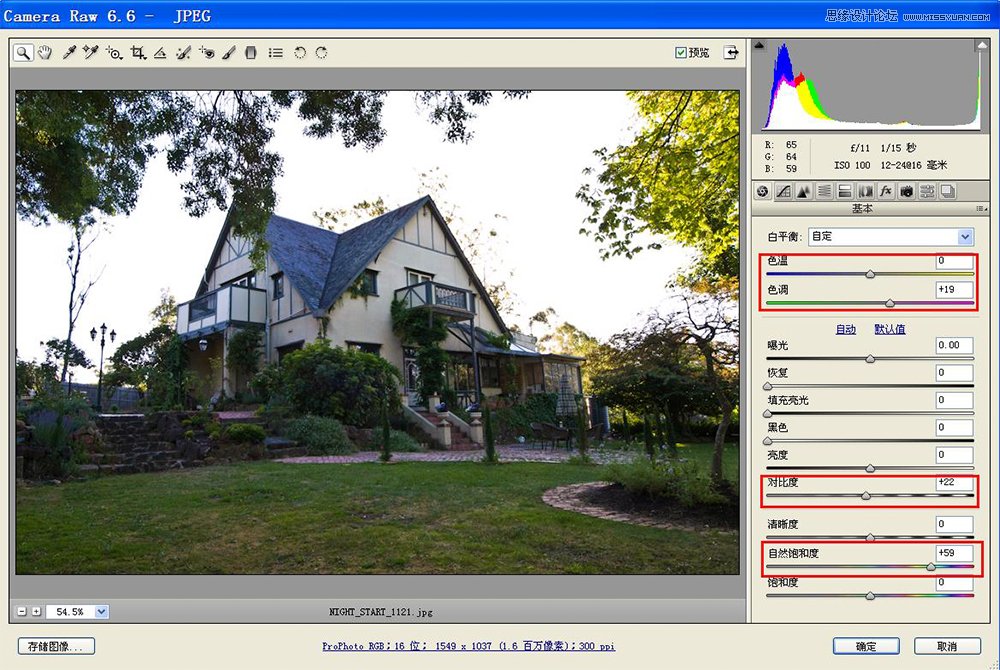 第4步:鼠标双击原图2副本,进入Adobe Camera Raw界面,对白平衡、对比度、自然饱和度进行调整,使片子整体略偏暧,明暗对比较强,色彩浓郁,主要是营造建筑物傍晚灯光对草地及周边环境映射的效果。