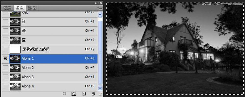 第11步:取消选区,选择Alpha1通道,按Ctrl+A,再按Ctrl+C。