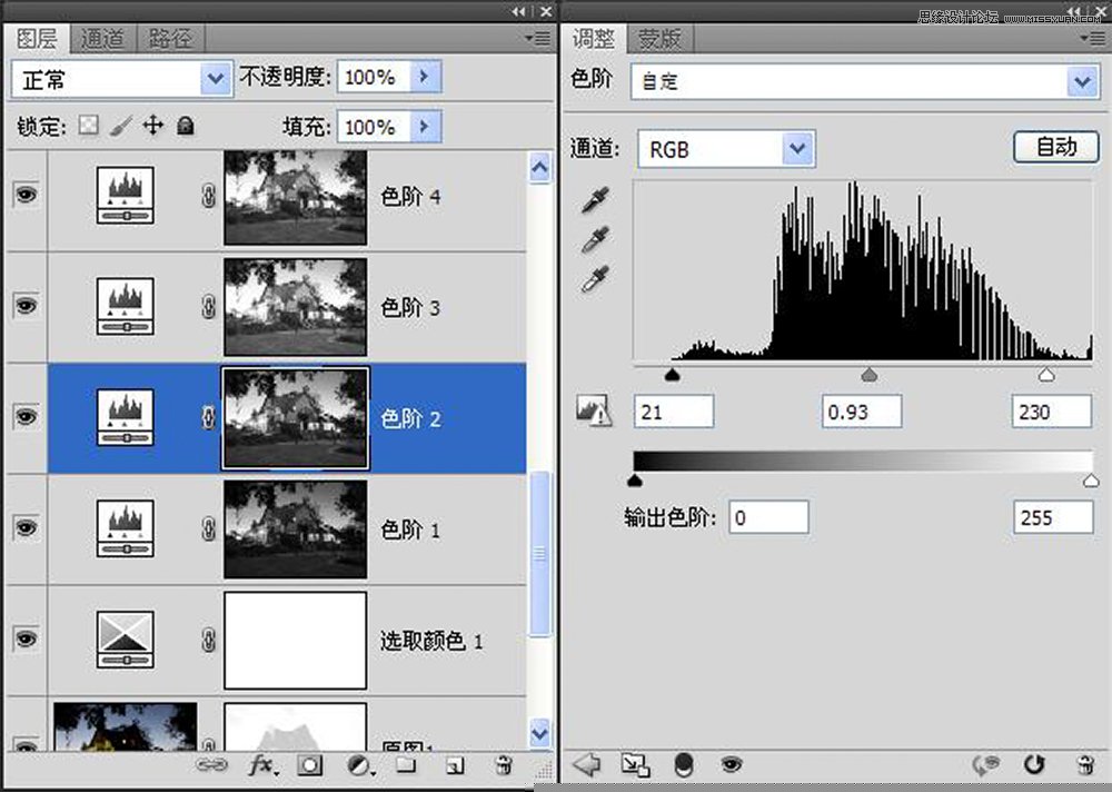 第12步:按住ALT键点击色阶1蒙板,使图像恢复正常状态,依次对色阶1-4进行调整。以下为调整的参数。