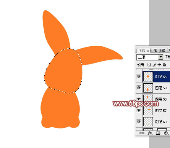 1、新建一个800 * 800像素的文档,背景填充黑色。新建几个图层,分别把兔子的头部、耳朵、身子、脚等几部分勾出选区后填充颜色,不同的部分放置在不同的图层,效果如下图。