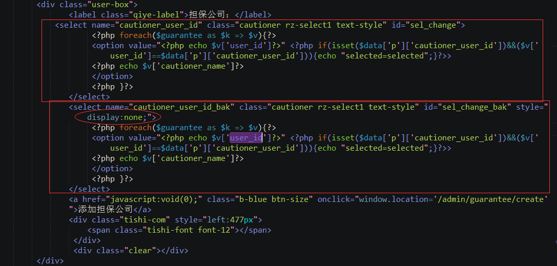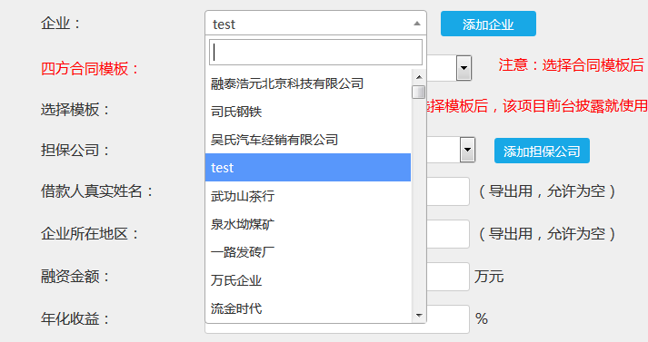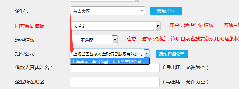 相互关联,如果有担保公司则下拉框只显示一个担保公司,其他不显示,若没有,全部显示,让管理员选择。