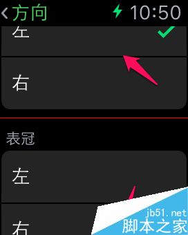 5、如我们佩戴到右手的话,就选择右方,表冠选择左方即可。然后我们再把手表拆下换到右手佩戴。