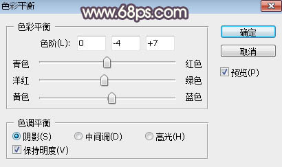 2、创建色彩平衡调整图层,对阴影,中间调进行调整,参数设置如图2,3,效果如图4。这一步给图片增加暖色。