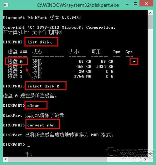 在Diskpart里输入"List Disk",然后输入“Select disk 0”(注:不一定是0,可能是1或者2,判断根据是看0是不是GPT磁盘)。