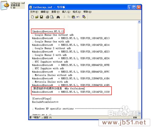 在下载的文件“tetherxp.inf”上右击,选择打开方式为“写字板”,用写字板程序打开并编辑文件。然后定位到“[AndroidDevices.NT.5.1]”字段的后面并填加如下内容: