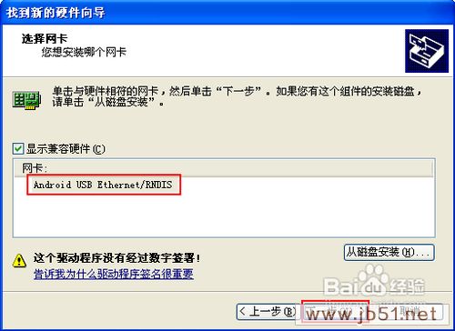 点击“从磁盘安装”,在打开的对话框中定位并选择经过修改的“tetherxp.inf”文件。然后直接点击“下一步".