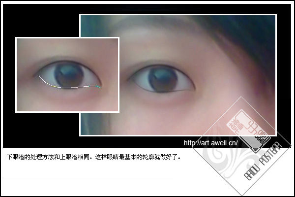 2、下眼睑的处理方法和上眼睑一样,这样眼睛最基本的轮廓就做好了。
