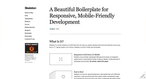 相比前两者来说,Skeleton在国内用户心目中没有那么高的地位。它使用简单的网格系统,有一系列CSS和JS文件的集合,这使得基于Skeleton的网站能够根据不同分辨率的设备(电脑、平板、手机等)快速调整,能让用户界面更友好,优化用户体验。虽然Skeleton只定义了部分标准HTML元素以及960px的标准模板,但并不影响一般网站的搭建需求。也正是因为这个原因它比较容易上手,尤其适合一些小项目的搭建。