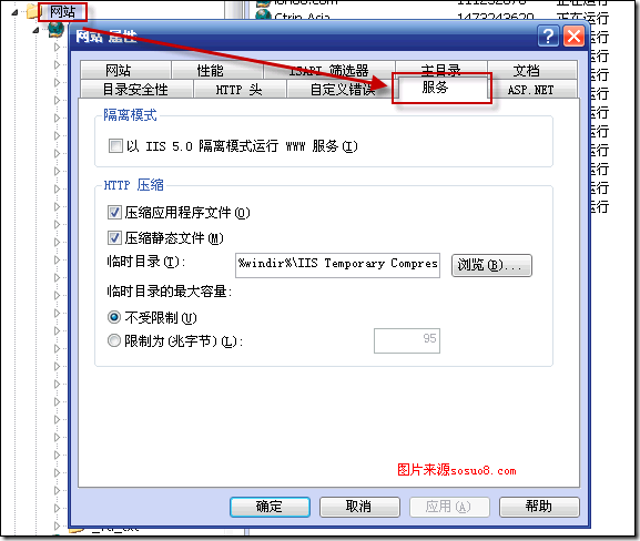 1.打开Internet信息服务(IIS)管理器,右击"网站"->"属性",选择"服务"。在"HTTP压缩"框中选中"压缩应用程序文件"和"压缩静态文件",按需要设置"临时目录"和"临时目录的最大限制";