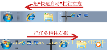 现在任务栏已经解锁。我们可以自由的拖动上面的东西。稍微用点力,需要乾坤大挪移一下。把快速启动栏往左拖到不能再拖的位置。然后把任务栏往右拖,快速启动栏自动就到了最左边。