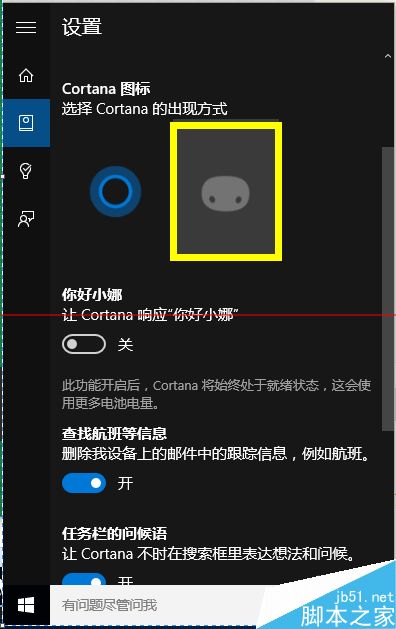 3、从打开的“Cortana设置”界面中,点击如图所示的“开关”即可实现“开启”或“关闭”Win10正式版系统中的Cortana搜索功能。