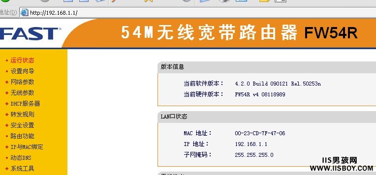真真的关键功能开始了,在这儿我以自己的FAST路由器做为例子。默认fast的管理台地址是:http://192.168.1.1/,输入帐号密码。这个帐号是必须的,如果你不是路由管理员,那你要想些办法搞到才行。进入管理中心后就是下面这样: