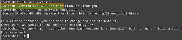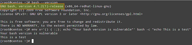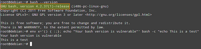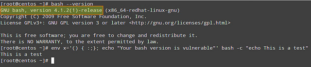 $ env x='() { :;}; echo "Your bash version is vulnerable"' bash -c "echo This is a test"