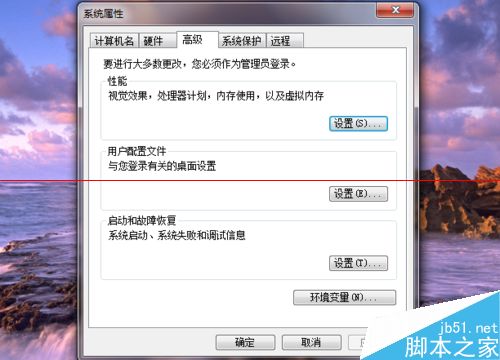 3、弹出了如图系统属性窗口,默认打开“高级”选项卡;