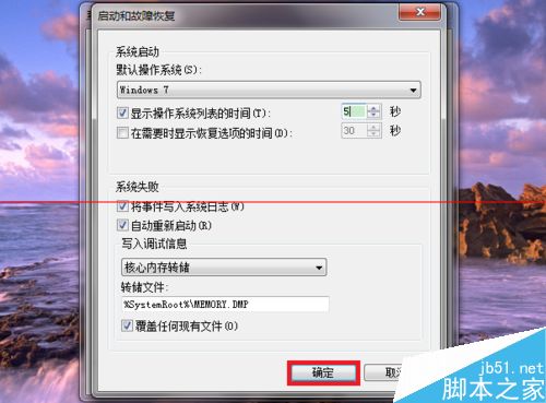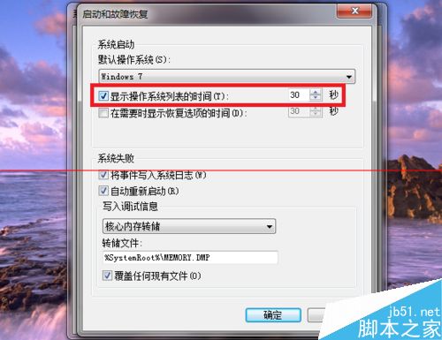 5、又弹出启动和故障恢复窗口,在系统启动设置下更改“显示操作系统列表的时间”;