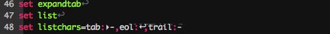 ``` set list↩ set listchars=tab:▸-,eol:↩︎,trail:-↩