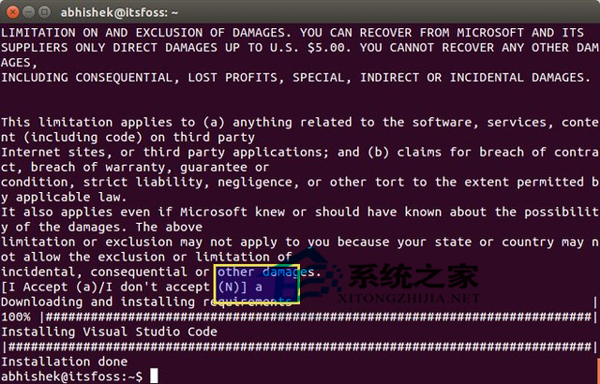 经过一系列要求和条件后,询问你是否确认安装Visual Studio Code。输入“a”来确定: