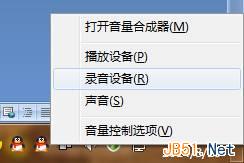 1.利用鼠标右击win7系统桌面右下角的音量图标选择“录音设备”;如下图所示: