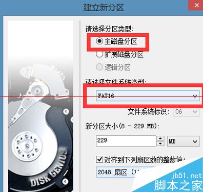 5、建立主磁盘分区 格式fat16 点确定