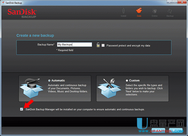 8. 点击并选择 SanDisk Backup Manager 将被安装到您的计算机上以确保自动并持续备份 复选框,以便您每次插入Cruzer Ultra Backup闪存盘到您的计算机时 SanDisk Backup 会自动运行。点击下一步。