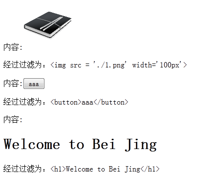 <?php require_once 'Zend/Filter/Htmlentities.php'; $filter = new Zend_Filter_HtmlEntities(); $temp1 = "<img src = './1.png' width='100px'>"; $temp2 = "<button>aaa</button>"; $temp3 = "<h1>Welcome to Bei Jing</h1>"; echo "内容:".$temp1."<p>经过过滤为:"; echo $filter->filter($temp1); echo "<p>"; echo "内容:".$temp2."<p>经过过滤为:"; echo $filter->filter($temp2); echo "<p>"; echo "内容:".$temp3."<p>经过过滤为:"; echo $filter->filter($temp3); echo "<p>";