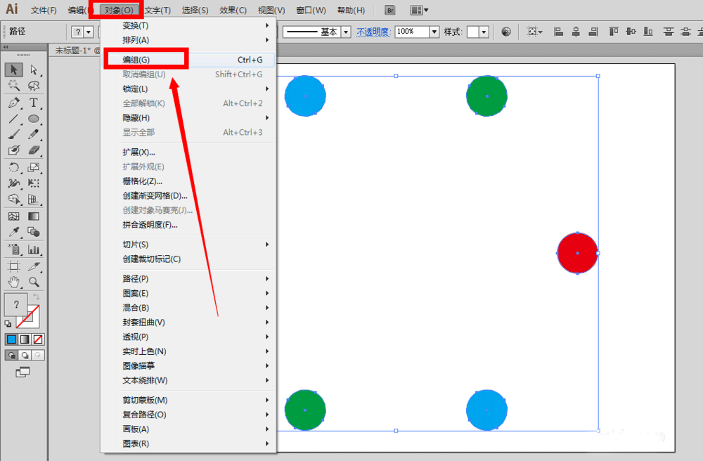 7、接着,全部选中所有的正圆,点击菜单栏的对象——编组按钮