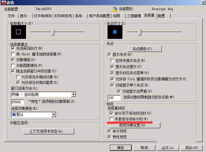 2、再调出【选择集】选显卡,取消【未激活任何命令时】前面的钩。如下图所示。