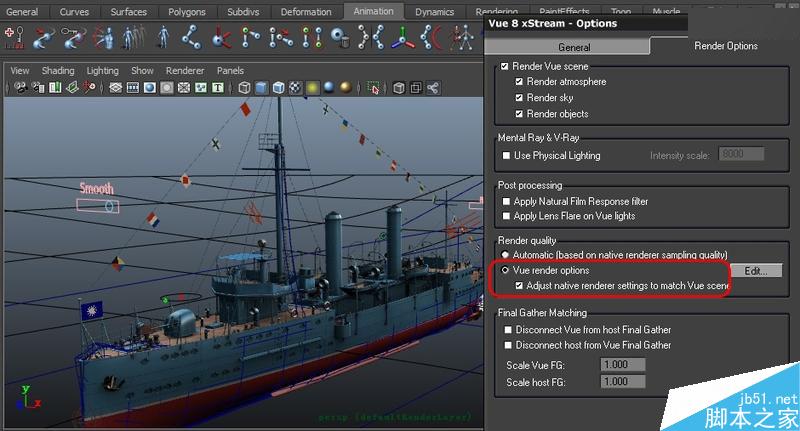 4.灯光和渲染的设置。因为场景使用了maya的灯光和海洋材质,会与Vue大气产生反射影响,所以最后是通过maya的mentalRay进行渲染。File->Options->RenderOptions->Render quality,选择Vue render options。Automatic是以mentalRay的采样级别来控制渲染画面的质量,而选择Vue render options则是以Vue的内部设置来完成。因为经过渲染测试,发现使用Vue的内部设置在效率和质量上稍稍具有优势。