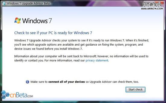 微软刚刚释放出了Windows 7升级顾问(Windows 7 Upgrade Advisor),这个软件最大的作用就是可以检测你的计算机是否能够正常运行Windows 7,或者需要升级哪些组件,包括软件和硬件两方面,检测后会提供一份报告并给出相应的建议。