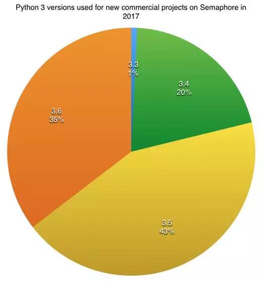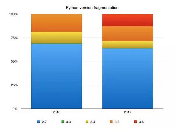 相较而言,使用 Python 3 的开发者更愿意进行版本更新。去年,Python 3.5 的使用率达到 60%,Python 3.4 的使用率占 30%。今年的调查数据显示,3.5 版和 3.4 版的使用率分别只占 34% 和 20%,有 35% 的用户已经开始使用 Python 3.6。