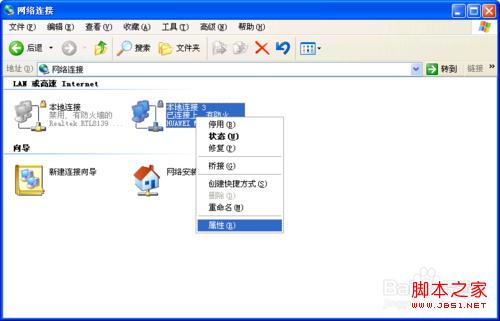 在打开的网络连接窗口中,右击要显示的“本地连接”图标,从弹出的菜单中选择“属性”项。