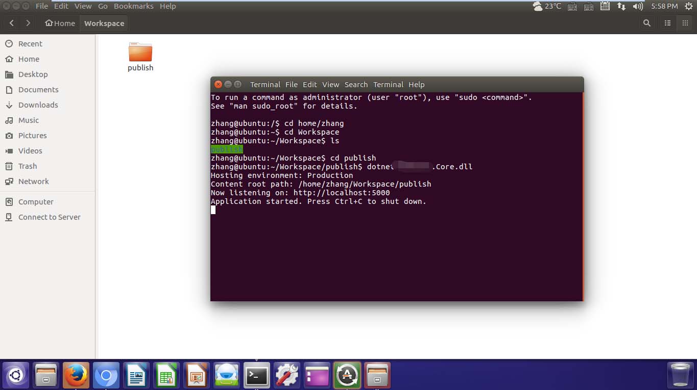 2、首先在Linux中创建一个Workspace文件夹,我放在/home/Workspace。然后把发布包拷贝到Workspace中。然后使用命令dotnet Works.Core.dll