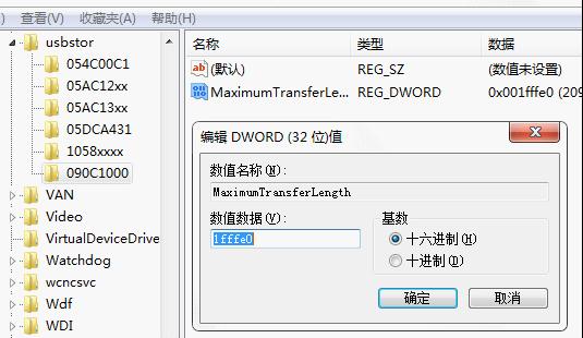 运行regedit,打开注册表编辑器,依次点击展开HKEY_LOCAL_MACHINE\SYSTEM\CurrentControlSet\Control\usbstor。在usbstor下有几个子项目,新建一个名为“090C1000”的项,并选中它,然后在窗口右边的空白处右击新建一个名为“MaximumTransferLength”的DWORD值,然后双击,把它的值改为001fffe0(如图2,十进制数值为2097120,也就是2MB)。保存后重启系统。