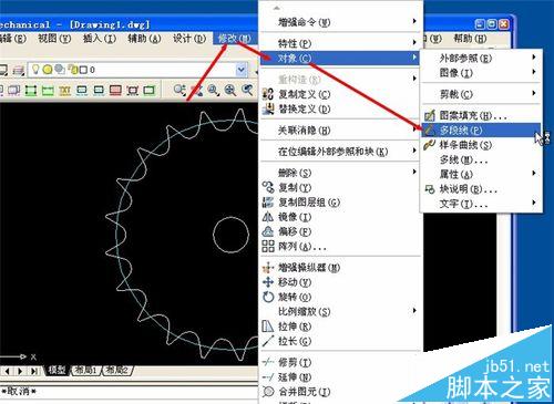 1)选择“修改(M)”菜单,选择“对象(C)”,选择“多段线(P)”。