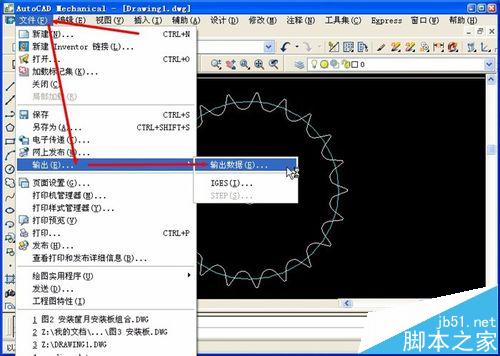 1)点击AutoCAD主菜单的“文件(F)”菜单,选择”输出(E)…“,再选”输出数据(E)…“。