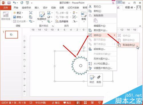 2)点击鼠标右键,在弹出的快捷菜单中选择“组合(G)”,再选择“取消组合(U)”。
