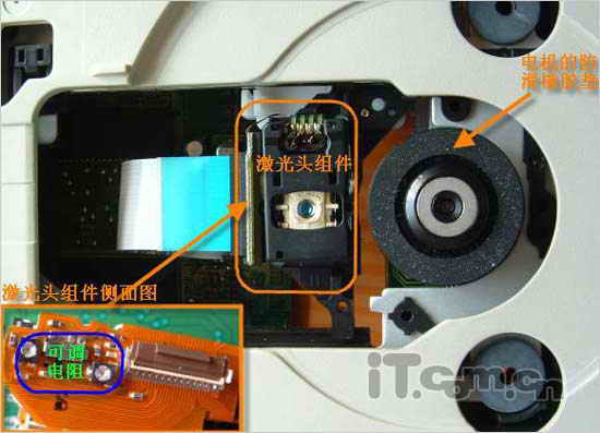 对于激光头功率下降来说,引起的读碟能力下降来说,如图所示可以简单的调整激光头侧面的一个2K的无限位电位器(可调电阻)。这就是激光头功率调节电位器。用万用表测量电位器的两个引脚,记下阻值,然后用小螺丝刀轻轻旋转,测量电阻,将阻值调节到原来的的2/3。一般多调节几次即可把握调节的尺度。
