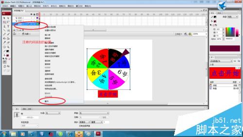 8、给影片剪辑转盘添加代码,选中转盘所在的图层1,在引用帧上右击,选择动作,添加代码