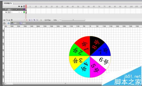 2、新建一个影片剪辑元件,然后绘制转盘,也可以用其他图像软件绘制好导入进来。绘制的时候可以借助网格等辅助线,分成多少分可以根据实际需要。