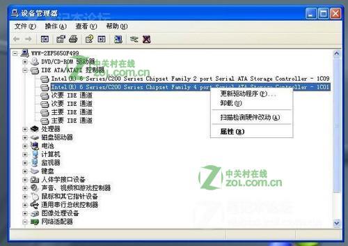 打开设备管理器,打开IDE/ATA控制器,其中两个设备,结尾为1C09的是硬盘控制器,1C01的是光驱控制器,更新光驱控制器,右键1C01,更新驱动程序