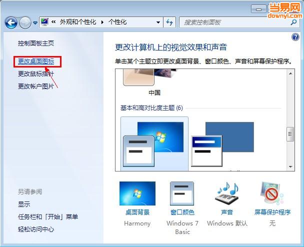 在“个性化”窗口中,单击“更改桌面图标”链接。