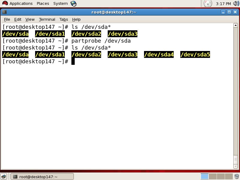 修改完成后,使用ls /dev/sda*命令查看磁盘设备,发现所作修改尚未显示,此时需敲partprobe/dev/sda 通知系统探测内核,截图如下: