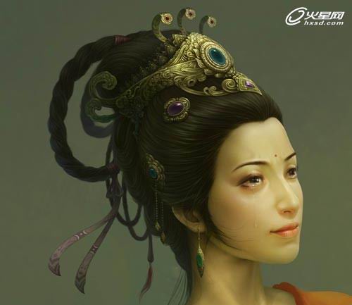 画头饰。我想要的是青铜的质感,因此金属光泽不能太强,但是又要表现出金属感来,其实很简单。用减淡工具在“范围”处调为高光,就这样把高光画出来。需要的时候再用通道提纯下亮和反光。(图24)
