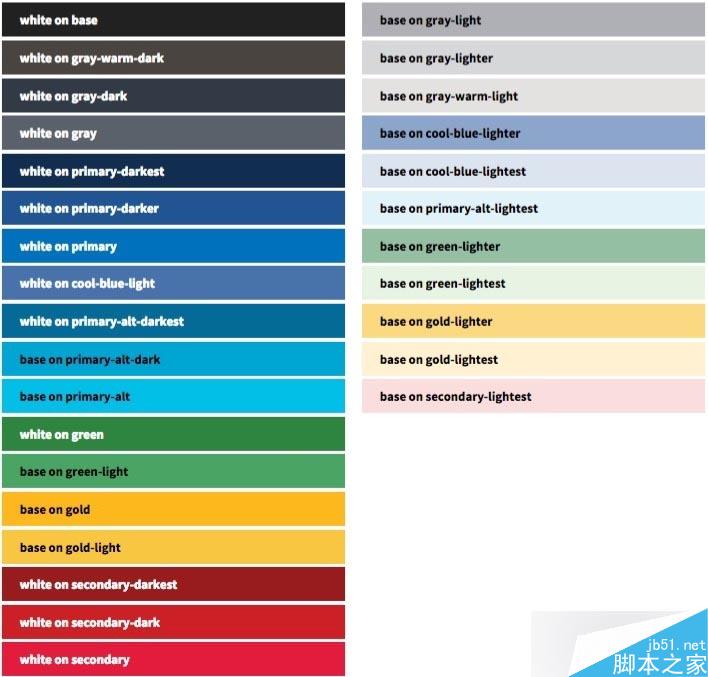 (下图是引用了美国网页设计规范中的视觉某部分,由于Web规范颜色有上百种,我们不可能一一记住,我们只需要熟悉这几种常用的色彩,有一个感觉,背景色和文字色,那我们在配色的时候也可以直接引用,我们只要记住了这些常用色在色板中的位置,它的明度和饱和度的差异,那我们很容易直接调用它们。)